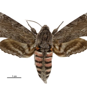 The wingspan is 80–105 mm. This hawkmoth's basic coloration is in grayish tones, but the abdomen has a broad gray dorsal stripe and pink and black bands edged with white on the sides. The hindwings are light gray with darker broad crosslines. Its favourite time is around sunset and during the twilight, when it is seen in gardens hovering over the flowers. This moth is very attracted to light, so it is often killed by cars on highways. Its caterpillars eat the leaves of the Convolvulus, hence its Latin name "convolvuli". Other recorded food plants include a wide range of plants in the families Araceae, Convolvulaceae, Leguminosae and Malvaceae. It can be a pest of cultivated Ipomoea batatas (sweet potato or kūmara) in New Zealand and the Pacific. It feeds on the wing and has a very long proboscis (longer than its body) that enables it to feed on long trumpet-like flowers such as Nicotiana sylvestris. The caterpillars can be in a number of different colours. As well as brown (pictured below) they have been seen in bright green and black.