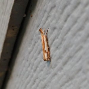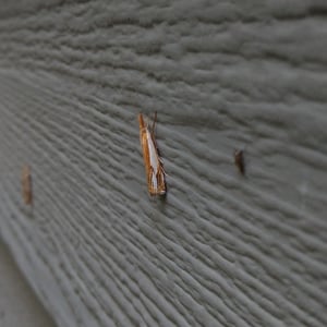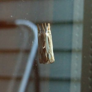 The adult moth is whitish or light gray to tan. Many species have patterns of colors, including silver, gold, yellow, brown and black. The moths are approximately 12 mm long, with wingspans of 20 - 25 mm. Like other snout moths, they have long labial palpi that extend in front of their heads, and fold their wings underneath their bodies, making them slender and harder to see while resting on plants.