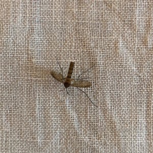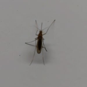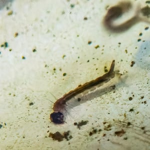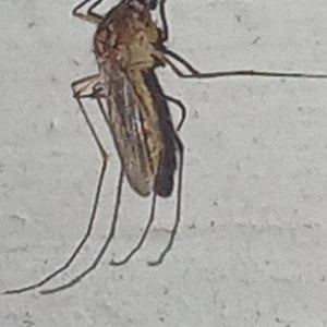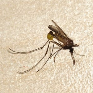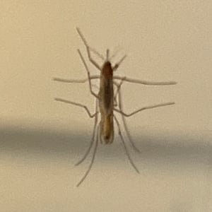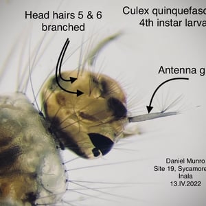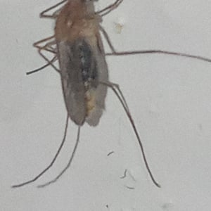 Depending on the species, the adult Culex mosquito may measure from 4 - 10 mm. The adult morphology is typical of flies in the suborder Nematocera with the head, thorax, and abdomen clearly defined and the two forewings held horizontally over the abdomen when at rest. As in all Diptera capable of flight, the second pair of wings is reduced and modified into tiny, inconspicuous halteres. Formal identification is important in mosquito control, but it is demanding and requires careful measurements of bodily proportions and noting the presence or absence of various bristles or other bodily features. In the field, informal identification is more often important, and the first question as a rule is whether the mosquito is anopheline or culicine. Given a specimen in good condition, one of the first things to notice is the length of the maxillary palps. Especially in the female, palps as long as the proboscis are characteristic of anopheline mosquitoes. Culicine females have short palps. Anopheline mosquitoes tend to have dappled or spotted wings, while culicine wings tend to be clear. Anopheline mosquitoes tend to sit with their heads low and their rear ends raised high, especially when feeding, while culicine females keep their bodies horizontal. Anopheline larvae tend to float horizontal at the surface of the water when not in motion, whereas culicine larvae float with head low and only the siphon at the tail held at the surface.