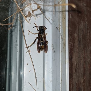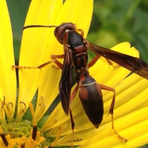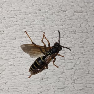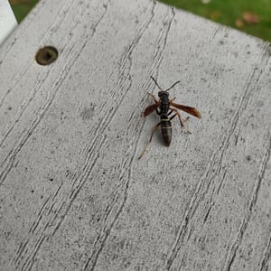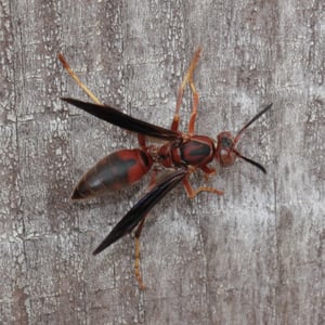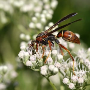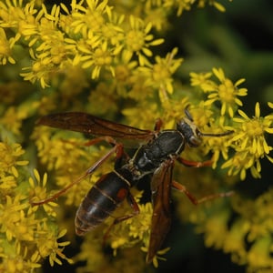 Polistes fuscatus, whose common name is the dark or northern paper wasp, is widely found in eastern North America, from southern Canada through the southern United States. It often nests around human development. However, it greatly prefers areas in which wood is readily available for use as nest material, therefore they are also found near and in woodlands and savannas. P. fuscatus is a social wasp that is part of a complex society based around a single dominant foundress along with other cofoundresses and a dominance hierarchy.