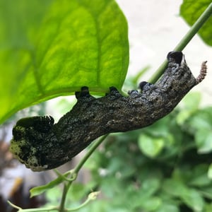 There are several generations of Acherontia atropos per year, with continuous broods in Africa. In the northern parts of its range the species overwinters in the pupal stage. Eggs are laid singly under old leaves of Solanaceae: potato especially, but also Physalis and other nightshades. However it also has been recorded on members of the Verbenaceae, e.g. Lantana, and on members of the families Cannabaceae, Oleaceae, Pedaliaceae and others. The larvae are stout with a posterior horn, as is typical of larvae of the Sphingidae. Most sphingid larvae however, have fairly smooth posterior horns, possibly with a simple curve, either upward or downward. In contrast, Acherontia species and certain relatives bear a posterior horn embossed with round projections about the thicker part. The horn itself bends downwards near the base, but curls upwards towards the tip. The newly hatched larva starts out light green with yellow stripes diagonally on the sides, but darken after feeding. In the second instar, it has thorn-like horns on the back. In the third instar, purple or blue edging develops on the yellow stripes and the tail horn turns from black to yellow. In the final instar, the thorns disappear and the larva may adopt one of three colour morphs: green, brown or yellow. Larvae do not move much, and will click their mandibles or even bite if threatened, though the bite is effectively harmless to human skin. The larva grows to about 120–130 mm, and pupates in an underground chamber. The pupa is smooth and glossy with the proboscis entirely fused to the body, as in most Lepidoptera, though unlike many other sphinx moths.