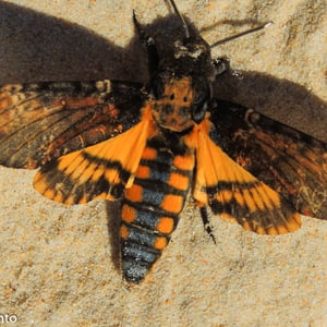 Acherontia atropos, the African death's-head hawkmoth, is the most widely recognized of three species within the genus Acherontia (the other two being Acherontia lachesis and Acherontia styx). It is most commonly identified by the vaguely skull-shaped pattern adorning the thorax, the characteristic from which its common and scientific names are derived. The species was first given its scientific name by Carl Linnaeus in his 1758 10th edition of Systema Naturae. Death's-head hawk moths are large, ranging from 3.5 to 5 inches (80–120 mm) as adults. The upper wings are dark, creating a stark contrast between them and the lower wings, which range from a bright yellow to a light cream, yellow being the more common. A. atropos appears in popular media, including the films The Silence of the Lambs (1991), Dracula (1958), and The Blood Beast Terror (1967). It is commonly found in the southern part of Europe and throughout much of Africa, from where it is considered to be a native species. Annually, A. atropos migrates to parts of Britain, most numerously to the British Isles, where it is less commonly seen than in its native place of residency.