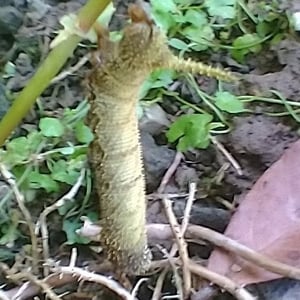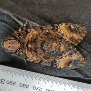 The African death's-head hawkmoth (Acherontia atropos) is the largest moth in the British Isles, with a wingspan of 5 in; it is a powerful flier, having sometimes been found on ships far from land. The forewings are a mottled dark brown and pale brown, and the hind wings are orangey-buff with two narrow dark bands parallel with the hind margin. The abdomen is a similar orangey-brown, with a broad, dark dorsal stripe. The most notable feature is a patch of short yellowish hairs on the thorax that gives the impression of depicting a human skull. It is a striking insect, but is seldom seen because it flies late in the night. A 2020 study describes how, when viewed upside-down, Acherontia atropos creates an illusion of a head with eyes: the mark on its thorax likened to a human skull is the "nose", with the skull's eye-sockets resembling nostrils. Spots on its forewings can be seen as eyes, and various other markings and features can be interpreted as ears, muzzle and lips. This illusion is also present in Agrius convolvuli (convolvulus hawk-moth) and five other species, with the study author suggesting that the function of the illusion of an eyed head is "almost certainly to deter, distract or otherwise deceive predators". The caterpillar of the African death's-head hawkmoth is also sturdy and somewhat variable in colour, being some shade of buff, green or brown, with seven diagonal blue lines. At the rear is a curved, thorn-like horn. It can attain a length of 5 to 6 in. The other two species of death's-head hawkmoth similarly have three larval color forms: typically, green, brown and yellow. The pupa is stout and reddish-brown, and is formed 8 to 10 in under the ground in a chamber the size of a large hen's egg.