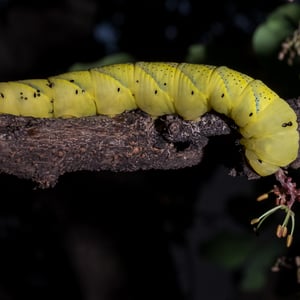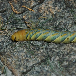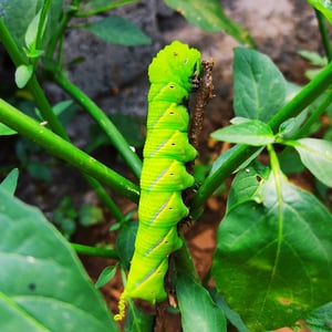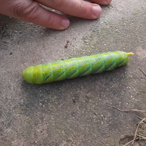 Eggs are laid singly under old leaves of a host plant and are green or greyish-blue. In the greater death's-head hawkmoth the host plant is usually the potato, but may also be tomato, woody nightshade, jasmine or common buckthorn. None of the three species is restricted to a single family of host plant, but hosts are typically in the families Solanaceae, Verbenaceae, Oleaceae, Bignoniaceae and others. The larvae are stout, reaching 120–130 mm, with a prominent tail horn. Larvae do not move much, and will click their mandibles or even bite if threatened. When mature, they burrow underground and excavate a chamber where they pupate.