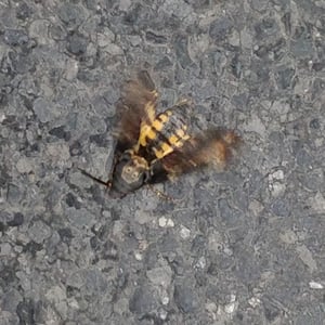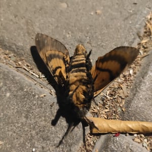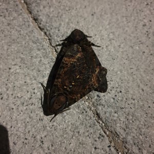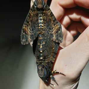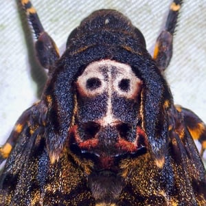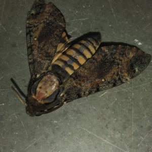 The name death's-head hawkmoth refers to any of three moth species of the genus Acherontia (Acherontia atropos, Acherontia styx and Acherontia lachesis). The former species is found in Europe and throughout Africa, the latter two are Asian; most uses of the common name refer to the European species. These moths are easily distinguishable by the vaguely human skull-shaped pattern of markings on the thorax. They are large nocturnal moths with brown and yellow or orange coloring, and all three species are fairly similar in size, coloration and life cycle.