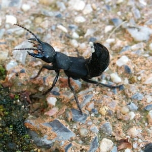 It is a predator, hunting mainly by night, feeding on a range of invertebrates, including worms, slugs, spiders, small moths, and woodlice, as well as carrion. The prey is caught in the mandibles, which are also used to cut and together with the front legs to manipulate the food into a bolus. The bolus is repeatedly chewed and swallowed, emerging covered with a brown secretion from the foregut, until it is reduced to a liquid that is digested. Skin (in the case of earthworms) and hard materials (from arthropods) are left. The larvae are also carnivorous with similar eating habits.