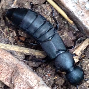 It is a long-bodied, black beetle. At about 20–32 mm (0.8–1.3 in), it is one of the larger British beetles. Its wing covers (elytra) are short, covering only its thorax, exposing the abdominal segments. The abdominal musculature is powerful and the abdominal segments are covered with sclerotized plates. It is capable of flight, but its wings are rarely used. It is covered with fine, black hairs. It is well known for its habit of raising its long and uncovered abdomen and opening its jaws, rather like a scorpion when threatened. Although it has no sting, it can give a painful bite with its strong, pincer-like jaws. It also emits a foul-smelling odour, as a defensive secretion, from a pair of white glands at the end of its abdomen.