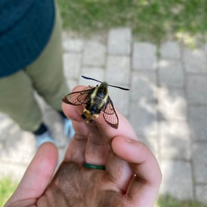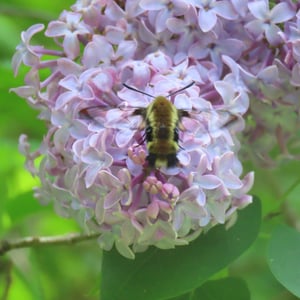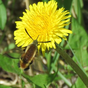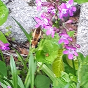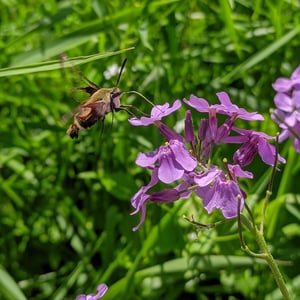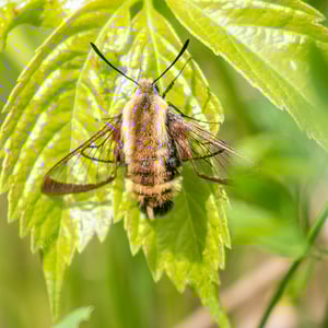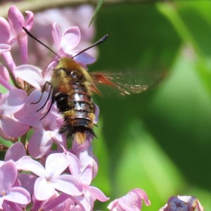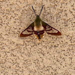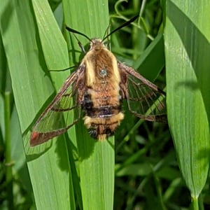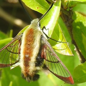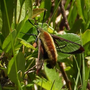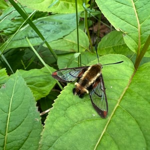 Hemaris aethra, commonly known as the Aethra clearwing moth, is a species of insect belonging to the family Sphingidae. It is found in parts of North America, including the United States and Canada. This moth has a wingspan of about 2 inches and displays a unique combination of clear and brownish-orange wings, resembling a bumblebee. Hemaris aethra is known for its swift and agile flight, often seen hovering near flowers while feeding on nectar.