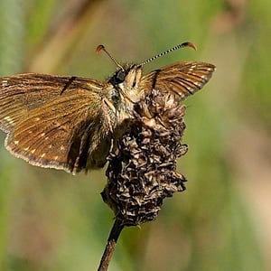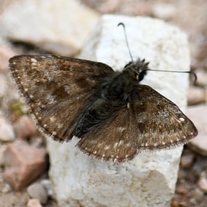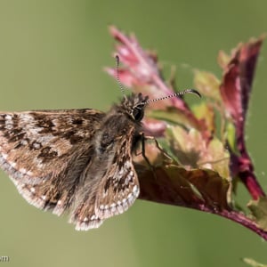 Erynnis tages is different from other skippers because of the predominantly monochrome, gray-brown wing coloration and the marbling, which is only present on the upper side of the forewings, as well as a series of small white dots on the wing edge. It is probably the most moth-like British butterfly and normally rests with its wings in a moth-like fashion. This well-camouflaged, brown and grey butterfly can be confused with the grizzled skipper, the Mother Shipton moth or the burnet companion moth. Faded specimens of Carcharodus alceae are distinguished by glass spots in the forewing and by a jagged rear wing edge. A special feature is the restraint of the imagos, which is reminiscent of an deltoid moth with its roof-shaped wings placed one on top of the other.