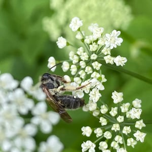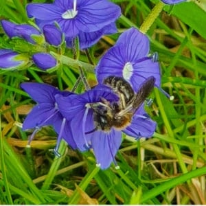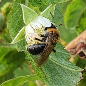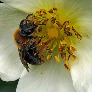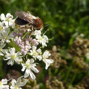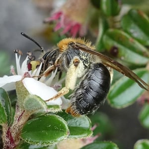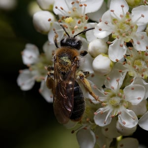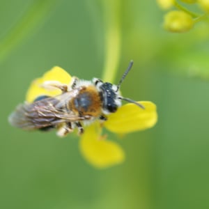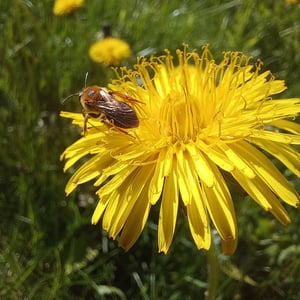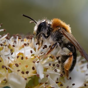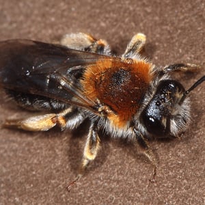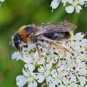 Andrena haemorrhoa, commonly known as the red-tailed mining bee, is a species of solitary bee found in Europe. It is characterized by its vibrant red-colored abdomen, which distinguishes it from other mining bee species. These bees are important pollinators, particularly for early spring flowers, and they construct underground nests where they lay their eggs.