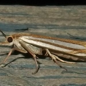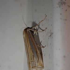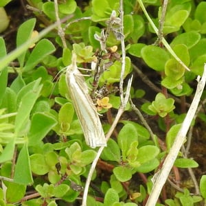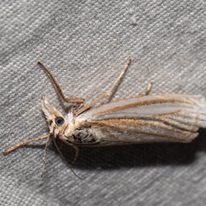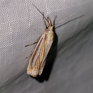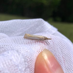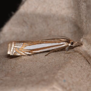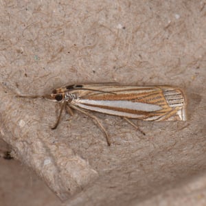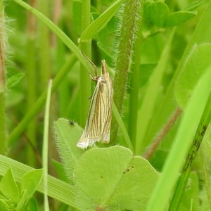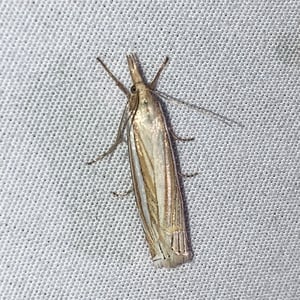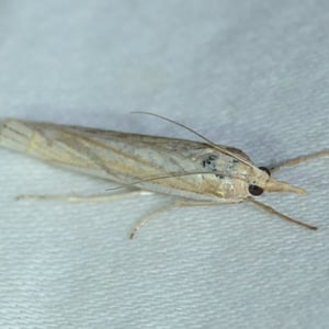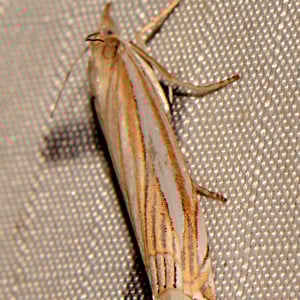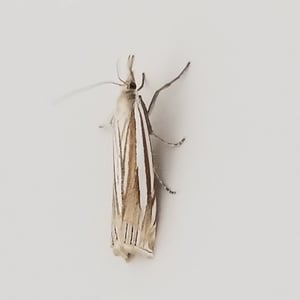 Crambus laqueatellus is a small moth belonging to the family Crambidae. It has a wingspan of about 15-20 mm and is commonly found in grassy habitats across North America. The adult moth has a pale brown coloration with intricate patterns on its wings. The larvae of Crambus laqueatellus feed on grasses and can be considered a minor agricultural pest.