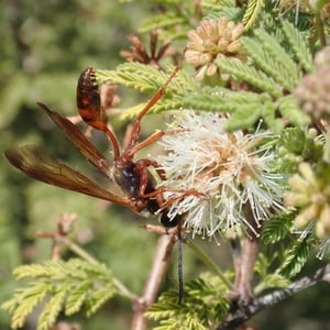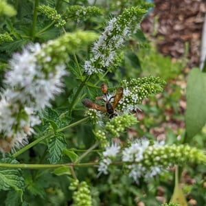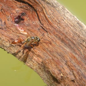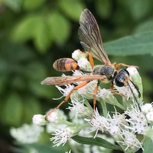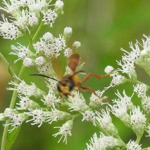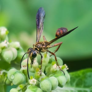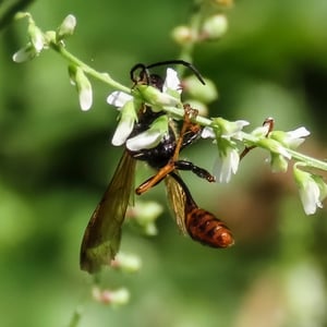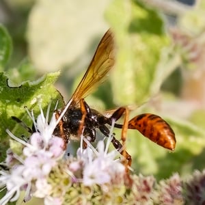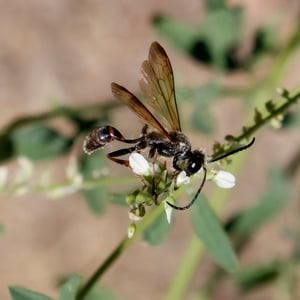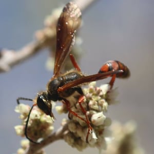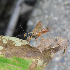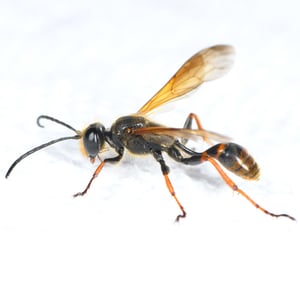Isodontia elegans, commonly known as the elegant grass-carrying wasp, is a species of solitary wasp belonging to the family Sphecidae. It is characterized by its slender body, metallic blue or green coloration, and intricate wing venation. These wasps are known for their unique behavior of constructing nests by carrying blades of grass to create individual cells for their offspring. They are primarily found in North America and are beneficial as they help control populations of grasshoppers and crickets.