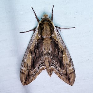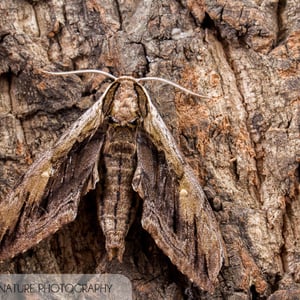 The overall coloring of the imago, or adult, elm sphinx is a gray-brown with wavy markings covering the forewings. In the upper center of the forewings, as with other Ceratomia species, there is a small white dot. The hindwings are a plain gray with a darker band running the length of the near-edge. The outer ends of the forewings and hindwings are both dashed with a light-dark-light pattern. Three broken, dark bands run the length of the body from the thorax to the tip of the abdomen. The antennae are stiff and wiry and have hook at the tips. Some specimens have a prominent splash of bright white on their upper head and wings and stand out considerably from other C. amyntor.