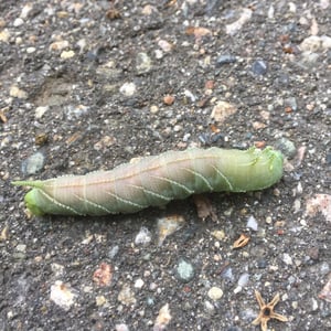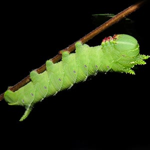 Larvae come in two different color phases; a green phase, and a dark phase which differs in shades of brown, orange, and somewhat of a pinkish brown. Larvae complete all five instars within approximately one month. The first instar is the same shade of green as its egg. As the larva progresses through its instars, change in structure is noticeable. The caterpillar sports four, long, horn-like projections - in addition to the tail horn - from above its head, which is why the elm sphinx is sometimes called the four-horned sphinx.