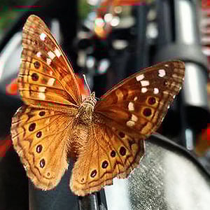 Adults are brownish orange, with white and black spots on the bottom of the wings. The length of the wings is 1.5 to 2 inches (38 to 51 mm).