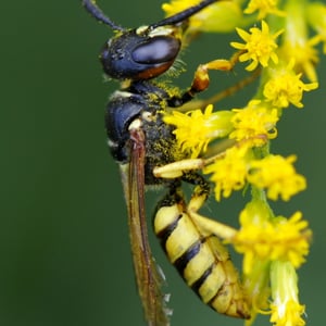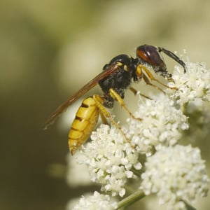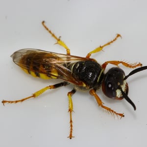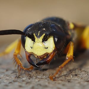 The European beewolf is a species of solitary wasp with bold yellow and black markings on the abdomen, males have trident-shaped markings between their bluish eyes while the larger females have a reddish stripe behind the eyes and a pale face.
