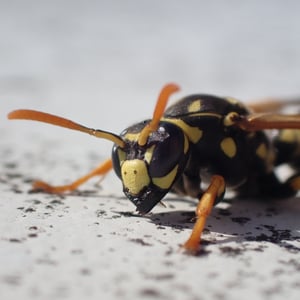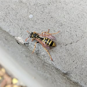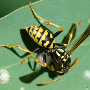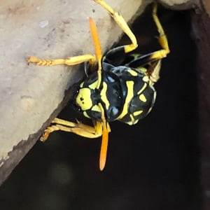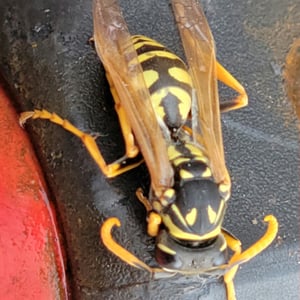 Little variation occurs among individuals of P. dominula; the wing lengths of males range from 9.5 to 13.0 mm, while those of females range from 8.5 to 12.0 mm. Its body is colored entirely yellow and black, similar to that of Vespula germanica, one of the most common and aggressive wasps in its native range. The female mandible is black and sometimes has a yellow spot. Females have a black subantennal mark that rarely has a pair of small, yellow spots. The female vertex sometimes has a pair of small, yellow spots behind the hind ocelli. Females have yellow, comma-shaped scutal spots.