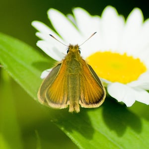 Thymelicus lineola, known in Europe as the Essex skipper and in North America as the European skipper, is a species of butterfly in the family Hesperiidae. With a wingspan of 2.5 to 2.9 cm, it is very similar in appearance to the small skipper, Thymelicus sylvestris. They can be told apart by the forward-facing flattish part of the antenna tip: in the Essex Skipper this face is black, whereas in the Small Skipper it is orange or brown. In males, there is a difference in the scent mark. In Essex Skipper this is a fine, straight, short dark line on the forewing, parallel to the wing edge; in the Small Skipper males, this line is bolder and bent. This butterfly occurs throughout much of the Palaearctic region. Its range is from southern Scandinavia through Europe to North Africa and east to Central Asia. It was only identified in the UK in 1889, and its range is expanding both in England and in northern Europe. In North America, this butterfly was accidentally introduced in 1910 via London, Ontario and has spread across southern Canada and into several northern US states. In many parts of the Northeastern United States it is the most abundant skipper.