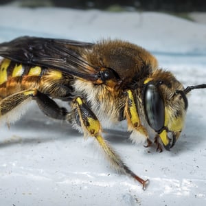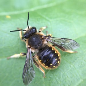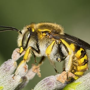 Anthidium manicatum, commonly called the European wool carder bee is a species of bee in the family Megachilidae, the leaf-cutter bees or mason bees.They get the name "carder" from their behaviour of scraping hair from leaves such as lamb's ears (Stachys byzantina). They carry this hair bundled beneath their bodies to be used as a nest lining. Like other members of the tribe Anthidiini, these bees do not cut leaves or petals as is typical for megachilids. The males engage in territorial behaviour, aggressively chasing other males and pollinators from their territory.This bee is native to Europe, Asia and North Africa. It has recently been seen in regions of South America, New Zealand, and the Canary Islands. They are generalists, and do not seem to prefer any plant genera for foraging, although in New Zealand native plants are visited less frequently by this bee species.It was accidentally introduced into North America from Europe some time in the mid 20th century, first seen in 1963 near Ithaca, New York, and since then an invasive pest.