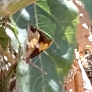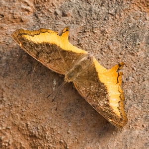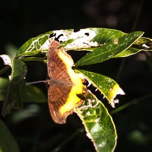 Wingspan: 40–50 mm in males and 45–55 mm in females. The male and female are very similar in appearance. The upperside of the wings is dark brown with a wide, yellow-orange band in the lower two-thirds of the forewing margin and the outer half of the hindwing. The underside of the wings is variegated in shades of brown.