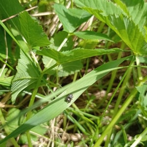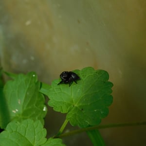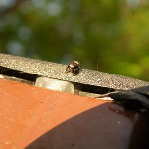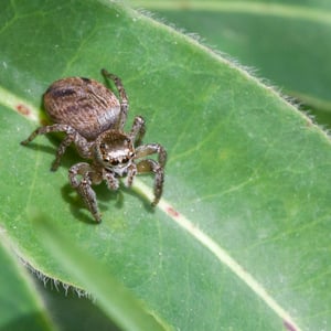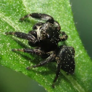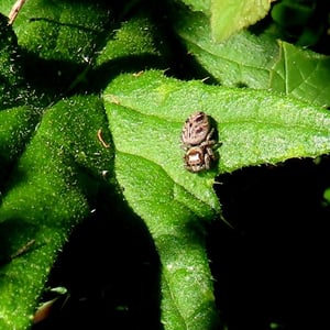 Males reach a body length of about six, females up to eight millimetres. The female has a brown and whitish cephalothorax, and an opisthosoma with a distinct pattern of black diagonal spots, sometimes with a white outline. The male is in contrast almost black with a copper-like gloss. His face features a horizontal pattern of black and white stripes. While males are found very frequently, females often hide in their retreats, for example between rolled leaves. During early winter she guards her egg sac here.