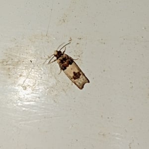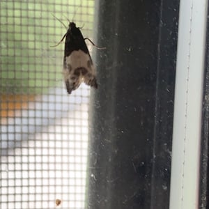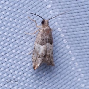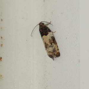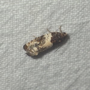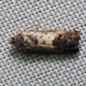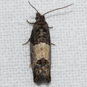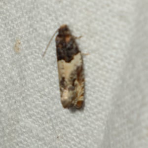 Spilonota ocellana, the bud moth, is a moth of the family Tortricidae. It is found in the Palearctic realm, from North Africa and Europe to Iran, eastern Russia, China (Hebei, Inner Mongolia, Jilin, Zhejiang, Fujian, Hubei, Sichuan, Shaanxi, Gansu, and Qinghai), Korea, and Japan. It is also present on Madeira and in North America. The wingspan is 12–17 mm. The forewings are whitish, sometimes partly suffused with grey, more or less strigulated with dark fuscous. The basal patch is dark grey, sometimes blackish-mixed, edge somewhat angulated and the central fascia form a dark grey sometimes indistinct costal suffusion, and there is a black-edged triangular praetornal spot. The ocellus is edged with leaden- metallic, enclosing several sometimes confluent black dashes. The cilia are dark grey. The hindwings are rather dark grey. The larva is pinkish-brown; head and plate of 2 dark fuscous: on blackthorn, larch, alder, etc.; May. The larch -feeding form distinguished as lariciana is usually somewhat smaller and darker. The moth flies from May to October depending on the location. There is one generation per year. The larvae feed on various deciduous trees and shrubs including Quercus, Betula, Sorbus and Vaccinium.