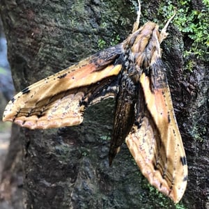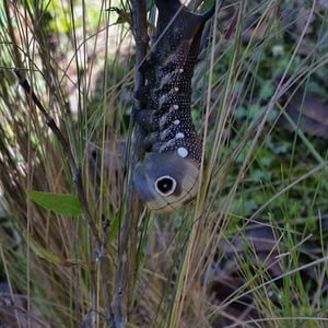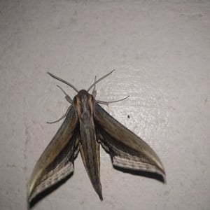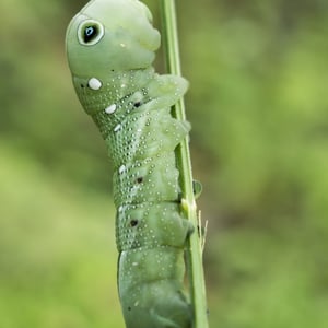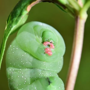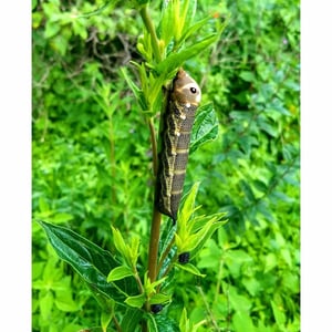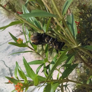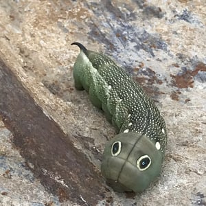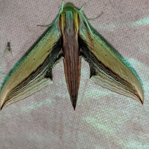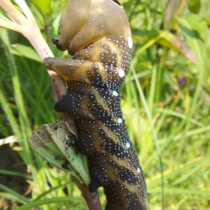 The larvae possibly feed on Bouvardia glaberrima. There is a single large eye on the thorax and six white circles down the side of the caterpillar. There are also extensive bands of white dots girdling the abdomen. Adults are on wing from June to September in Arizona and continuously in the tropics.