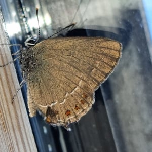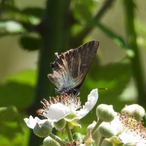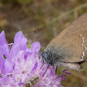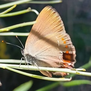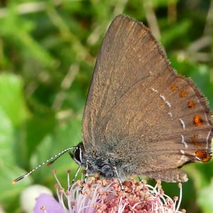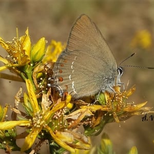 ab. esculi Hbn.[ of Satyrium ilicis ] (73b) (Fig. 559/560) is a small form with rather long tail and unicolorous upperside (there being only a small red spot at the anal angle); on the underside the row of bars of the forewmg is indistinct and the brownish yellow submarginal spots of the hindwing are but slightly prominent; Portugal, Spain and South France; according to the size of the discal patch of the forewing some transitional specimens have been provided with names (ilicioides, macidata), such as probably occur wherever ilicis is found. The yellow patch is apparently most strongly developed in North Africa.