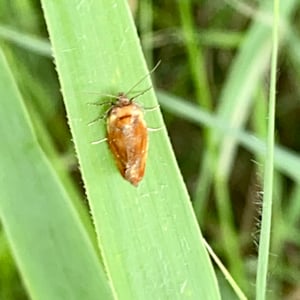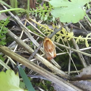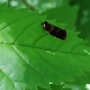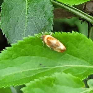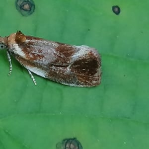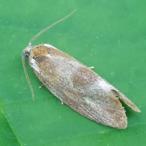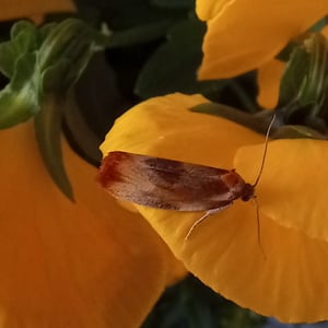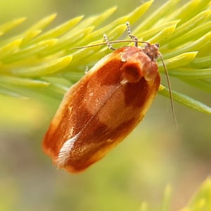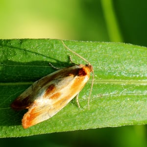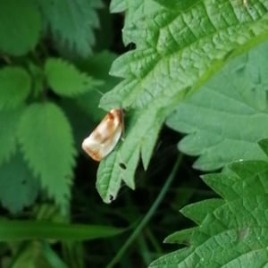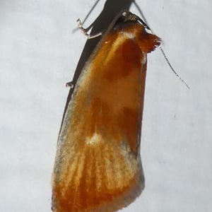 Eulia ministrana is a moth of the family Tortricidae. It is found in the Palearctic and Nearctic realms. The wingspan is 18–24 mm. The head is dark fuscous. The thorax is ferruginous-ochreous, with a large crest. The forewings are narrowed anteriorly and pale ochreous.The base of costa, a more or less developed very large triangular often pale-centred dorsal suffusion, and the terminal streak are all deep ferruginous.The cilia are dark ferruginous-fuscous. The hindwings are grey, the termen darker. The larva is light green head brown. Adults are on wing from May to June. There is one generation per year. The larvae feed on various shrubs and trees including Betula pendula, Rhamnus cathartica, Corylus avellana and Castanea sativa.