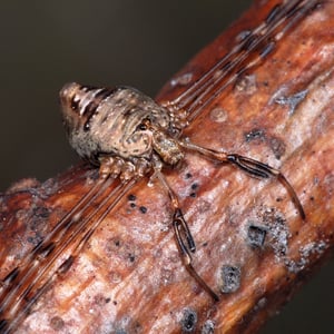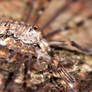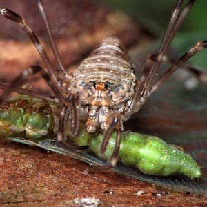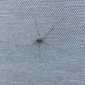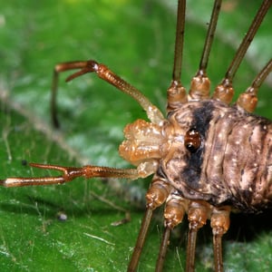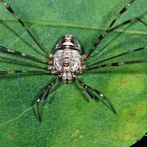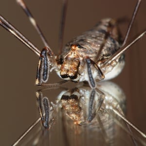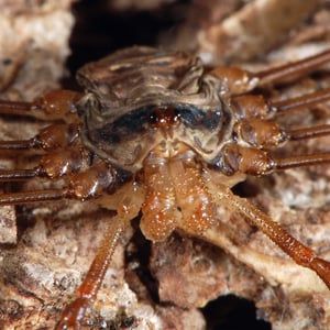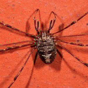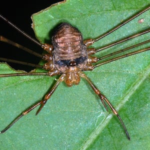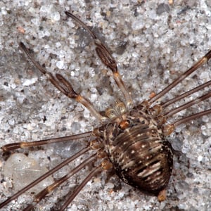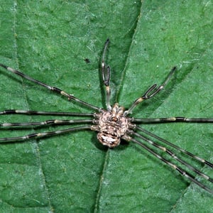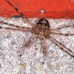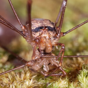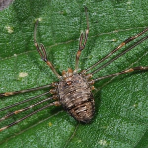 Dicranopalpus ramosus is a species of harvestman. Males are up to 4 mm long, females can reach up to 6 mm. Both sexes have very long legs (especially the second pair can reach up to 5 cm), with a distinct elongated apophysis that reaches almost to the end of the tibia. This makes their pedipalps look forked. Their body is brownish with dark markings, the females being lighter colored. The forked pedipalps and the resting posture, with the legs stretched to the sides, makes this species easy to identify, although the traditional method of collecting invertebrates does not prove adequate: of 103 individuals captured in Belgium, only one was found in a pitfall; all others were collected by hand. Adults can be found from August to November, mostly in gardens and on outer walls, but sometimes also inside.