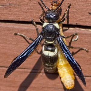 Like many wasps, Monobia quadridens is capable of delivering a sting. The pain caused by the sting of a female is similar to that caused by the bald-faced hornet or the ant Myrmecia nigriceps. Unlike most other wasps, however, the male is also capable of delivering a painful jab like a needle prick, although no venom is injected, so the pain is transient. The male has no stinger and uses the tip of its abdomen.