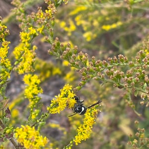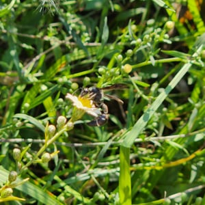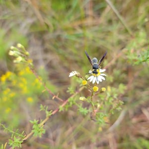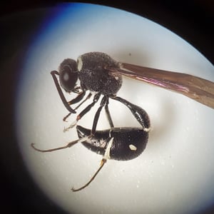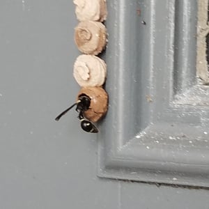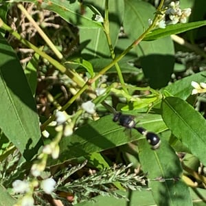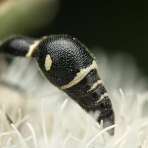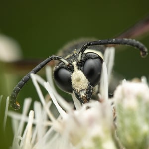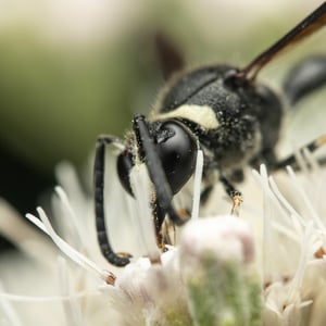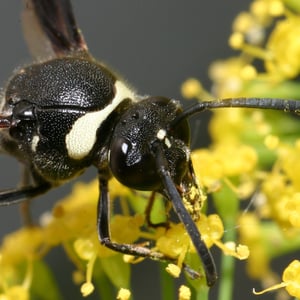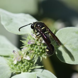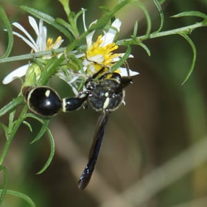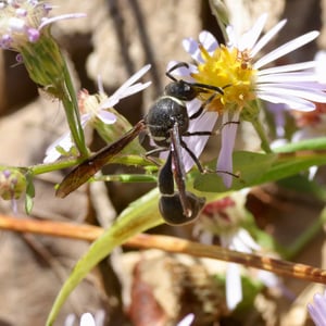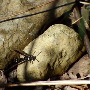 Like other members of the genus, the female Eumenes fraternus builds a pitcher-shaped nest in which to lay an egg. This is made with mud, the wasp collecting a drop of water and then a dry particle of soil, dampening the soil and putting it in place. Several hundred such fragments will be needed and the pot may take one or two hours to build. When it is ready, the wasp inserts her abdomen into the hollow interior and lays an egg, suspending it on a fine thread. She then searches for suitable food to put inside the pot on which her developing larva may feed. Usually this is the larva of a butterfly or moth that has been stung to paralyse it and which will remain alive and fresh until the developing wasp larva needs it. When she has placed enough provisions in the pot, the wasp seals the top with damp soil and goes off to build another nest. The adult insects feed mainly on nectar that they gather from flowers, but they also feed on pollen with its higher protein content.
