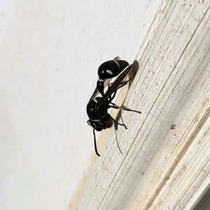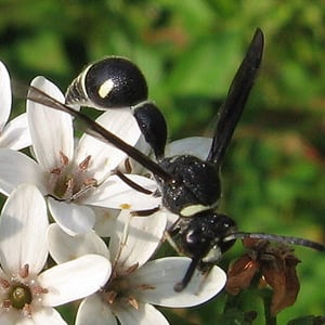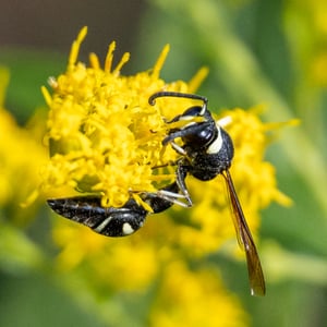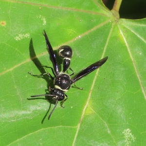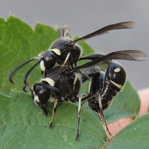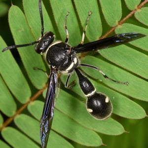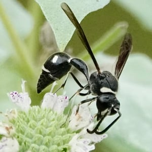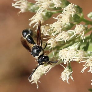 Eumenes fraternus is a species of potter wasp in the subfamily Eumeninae of the family Vespidae. It is native to the eastern United States and Canada. The female builds a miniature pot out of mud in which it lays an egg and places a live caterpillar. Its developing larva feeds on this whereas the adult wasp feeds primarily on nectar.