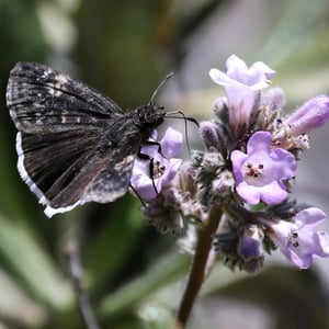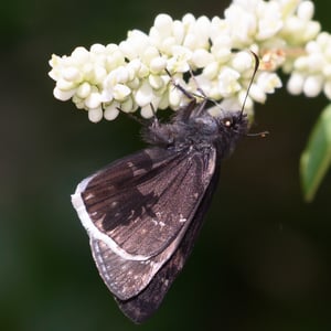Erynnis funeralis, the funereal duskywing, is a butterfly of the family Hesperiidae. It is found from southern California, Arizona, New Mexico and Texas, south to Argentina and Chile. Strays can be found north up to northern Illinois, north-eastern Nebraska, central Colorado, southern Nevada and central California. The wingspan is 34–45 mm. They are very similar to the mournful duskywing, but can be distinguished by narrower fore wing with a light brown patch along outer edge. Their wings are black and brown with a white fringe on the hind wings. Adults are seen from February to October. The larva have a black head and a green body with yellow hairs and yellow markings. Its host plant is often Medicago sativa. Larva feed on various plants, including Robinia neomexicana, Medicago hispida, Lotus scoparius, Olneya tesota, Vicia, and Acmispon. Adults feed on flower nectar.