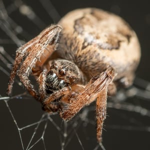 Females reach a body length of about 6–14 mm, males up to 5–9 mm. Leg spans range from 18 to 35 mm. These spiders can be identified by their large, oval-shaped, bulbous abdomens. Colors can range from black, grey, and shades of red. The carapace on their abdomen almost always has a lighter shaded arrow pointing toward their cephalothorax, while the legs also have a similar arrow pattern. Their eye structure consists of a horizontal row of 6 eyes, with an additional pair above the center of the row. A common misconception is that spiders cannot hear, due to their lack of ears of other common structures. However, these animals do have the ability to sense sound due to macrosetate and filiform hairs on their legs.
