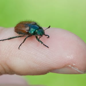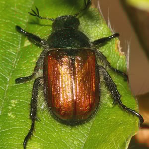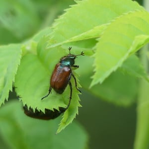 Phyllopertha horticola is approximately 8.5–11 millimetres (0.33–0.43 in) in size. Unlike Mimela of the family same family, these beetles have a non-ovoid body. They have chestnut-brown wing casings which are covered with a long upright pubescence. On each elytron run six longitudinal bands of small dots. Head and thorax are finely granulated. Head, thorax and legs are shiny dark green or bluish. The underside of the body is also green. The antennas are very short and end in a fan-like group of three lamellae, with which the beetle perceives fragrances. This species is quite similar to Popillia japonica .