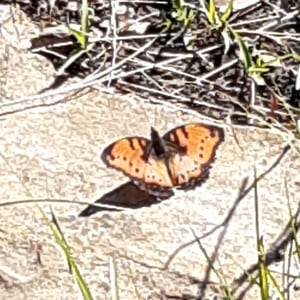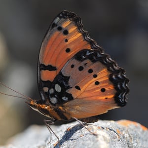 The larvae are variable; orange, or orange with black bands, or almost completely black. The final-instar larvae are black when reared at the lower temperatures associated with the winter form, and bright orange when reared at the slightly higher summer temperatures. Larval food plants are Lamiaceae including Coleus species, Plastostema species, Plectranthus esculentus, Plectranthus fruticosus, Rabdosiella calycina, Pycnostachys reticulata, Pycnostachys urticifolia, and Solenostemon species.