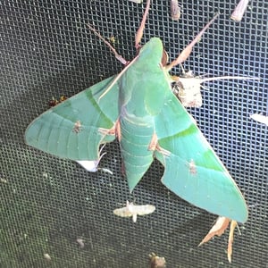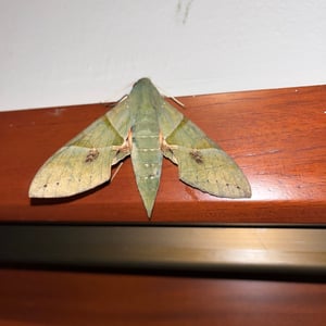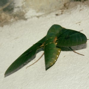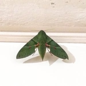 Wingspan of – inches (11–12 cm). Its body and dorsal forewings are a deep green color. The dorsal hindwings have purple-blue patches, yellow borders, and a red spot near the inner margin. The underside is yellow green and gray purple. Like most moths in the family Sphingidae, caterpillars pupate in burrows. This species was first described by Carl Linnaeus in his 1758 10th edition of Systema Naturae.