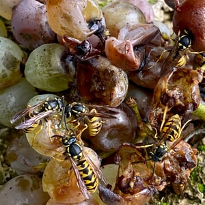 V. germanica wasps have a diverse diet. They are known to eat carrion, live arthropods (including spiders; ), fruit, honeydew, and processed human food and garbage. They are opportunistic scavengers and hunters able to obtain food from a variety of different sources. For example, many Vespula species have been observed feeding on dead honey bees (Apis mellifera) found outside the beehive entrance in the late summer. This flexibility in diet is beneficial, as V. germanica must often compete for resources with native biota in areas it invades.