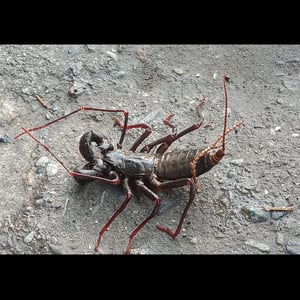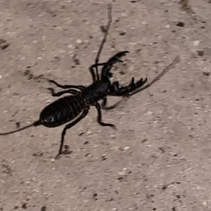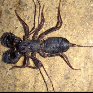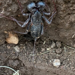 This species can grow to be 40-60 mm long, excluding the tail. They have six legs used for movement, two long antenniform front legs that they use to feel around for prey and detect vibrations, and two large pedipalps modified into claws that they use to crush their prey. They have a long, thin, whip-like tail, the origin of the common name whipscorpion. From the base of this tail they can spray a substance composed of 85% acetic acid in order to defend themselves. Acetic acid is the main component of vinegar, so the spray smells strongly of vinegar, leading to the common name "vinegaroon". Mastigoproctus giganteus have eight eyes: two in a pair on the front of the head and three on each side of the head. These eyes are very weak, so Mastigoproctus giganteus navigates mostly by feeling with its long front legs, tail, and pedipalps.