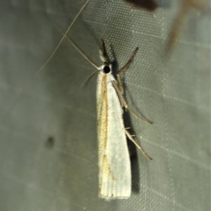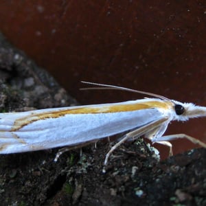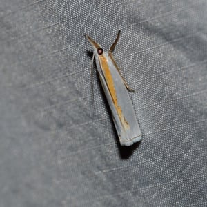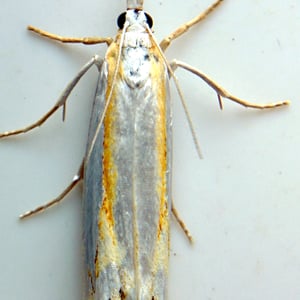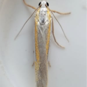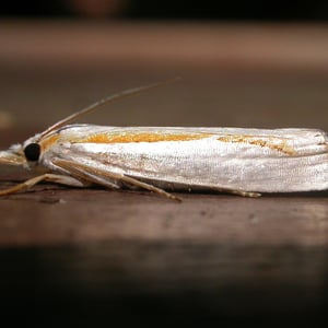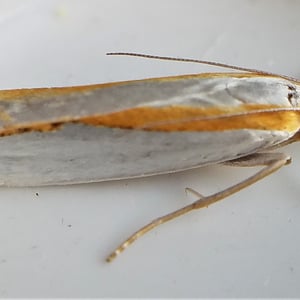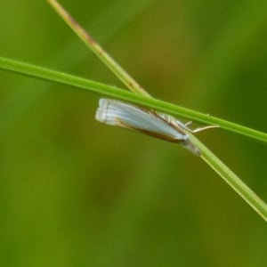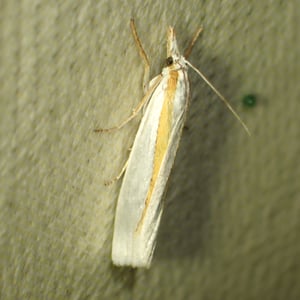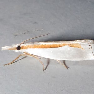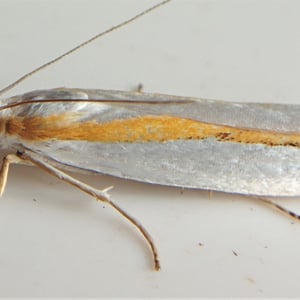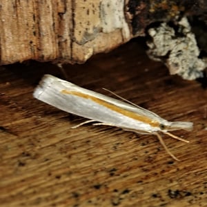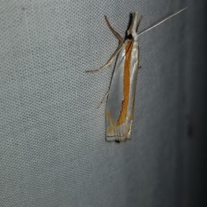 Crambus girardellus, or Girard's grass-veneer moth, is a moth in the family Crambidae described by James Brackenridge Clemens in 1860. It is found in North America, including Alberta, Ontario, Quebec, Labrador, Maine, New Hampshire, Massachusetts, New York, Pennsylvania, Maryland, Ohio and Michigan. The wingspan is 25–28 mm. The forewings are silvery white with a longitudinal orange discal stripe and a narrow brown terminal line. The hindwings are white. Adults are on wing in June and July. The larvae feed on the roots of grass species.