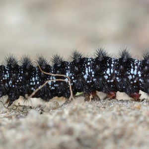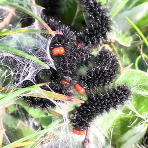 After hatching, Glanville fritillary caterpillars live in gregarious sibling groups. They feed on their host plant, either Plantago lanceolata (ribwort plantain) or Veronica spicata (spiked speedwell). Adult females prefer one plant over the other when choosing where to lay their eggs, but the larvae do not have a feeding preference for either plant when they are born.