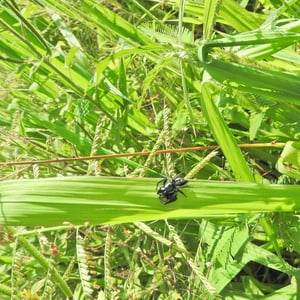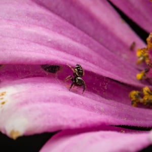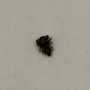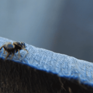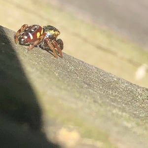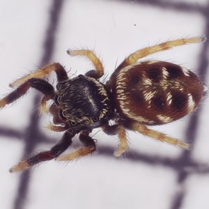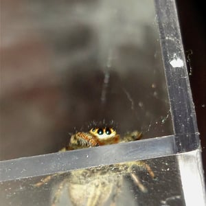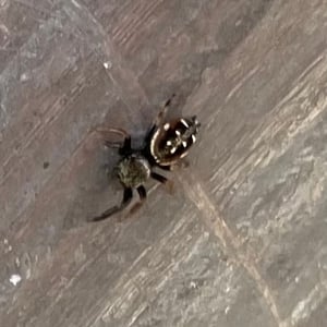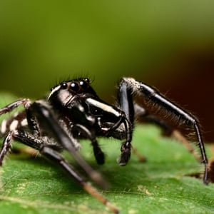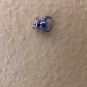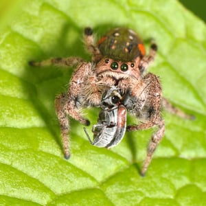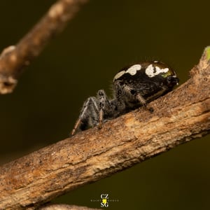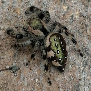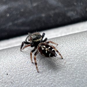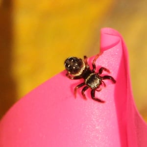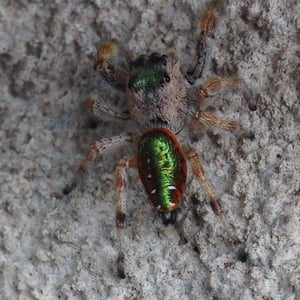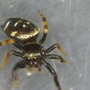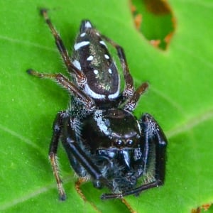 Paraphidippus aurantius is a species of jumping spider, commonly known as the emerald jumping spider or golden jumping spider. P. aurantius is a solitary hunter, with a fairly large size for a jumping spider. It is green or black with white side stripes on each side of its head and a white border around the top of the abdomen. It also has a midline of hairs down its center with small white dots and lines on either side.