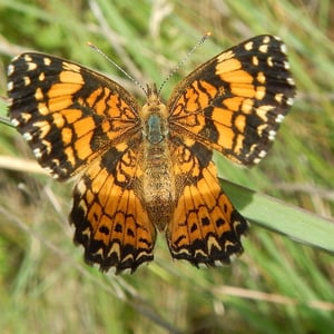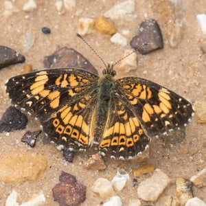 The gorgone checkerspot's range is in North America from Alberta east to southern Ontario, south into central Texas, between the Rocky Mountains and Appalachians. Within its range they can most commonly be seen in open areas including ridges, prairies and old fields. They can also be seen at streamsides and in open hardwood forests.