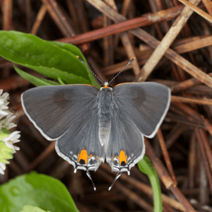 The caterpillars of the gray hairstreak butterfly consume a wide range of food plants. However, they do mainly use mallows and legumes as their preferred host plant. They commonly use clovers as their food plant as well, eating rabbit-foot clover (Trifolium arvense), white clover (T. repens), bush clover (Lespedeza capitata), white sweet-clover (Melilotis alba), and Malva neglecta. Young caterpillars are typically found eating flowers and fruiting bodies of their host plant while the older caterpillars eat the leaves.