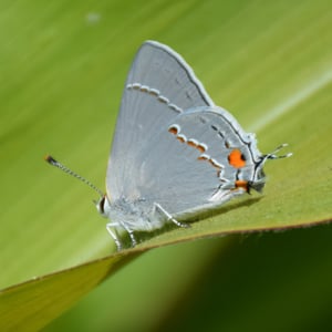 The adult gray hairstreak has a wingspan of 20 –. The upper sides of the wings are gray with an orange spot on the hind margin. The underside of the wings are a lighter gray with white and black lines and orange and blue marginal spots near the hind-wings' tail-like extensions. Caterpillars are green with markings on the sides, covered in short yellow hairs.