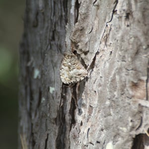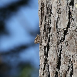 Hipparchia semele engages in cryptic coloring, or camouflage that makes it difficult to see them when they are resting on the bare ground, tree trunks, rocks, etc. Their tan and brown colored wings help them conceal themselves. Usually at rest and when not in flight, the butterflies keep their wings closed, with their forewings tucked behind their hindwings. This helps them conceal their eyespots and makes them appear smaller, further helping them camouflage to their environment. Additionally, the forewing of a Hipparchia semele has one large and one small eyespot. When the grayling butterfly believes it may have been detected by a predator, it exposes these spots. However, there may be a balance between their cryptic coloring behavior and the exposure of their conspicuous eye spots. Exposing their spots may increase detectability by their predators. Therefore, at rest, the grayling adopts its cryptic coloring position, pulling its forewings down behind its hindwings in order to conceal the eyespots.