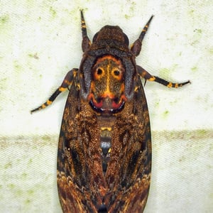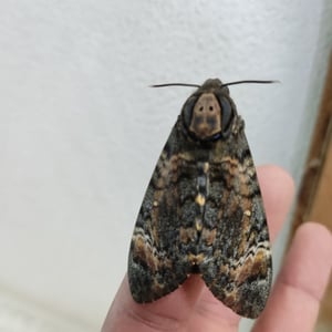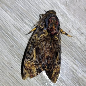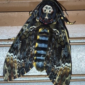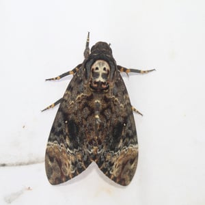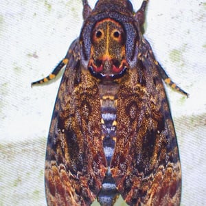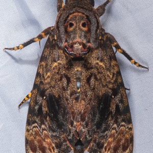 Acherontia lachesis, the greater death's head hawkmoth or bee robber, is a large (up to 13 cm wingspan) sphingid moth found in India, Sri Lanka and much of the Oriental region. It is one of the three species of death's-head hawkmoth genus, Acherontia. The species was first described by Johan Christian Fabricius in 1798. It is nocturnal and very fond of honey; they can mimic the scent of honey bees so that they can enter a hive unharmed to get honey. Their tongue, which is stout and very strong, enables them to pierce the wax cells and suck the honey out. This species occurs throughout almost the entire Oriental region, from India, Pakistan and Nepal to the Philippines, and from southern Japan and the southern Russian Far East to Indonesia, where it attacks colonies of several different honey bee species. It has recently become established on the Hawaiian Islands.