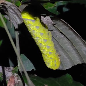 A. lachesis is much larger than Acherontia styx. The segmental bands and grey stripe occupy so much of the abdomen that only small patches of yellow are left. The hindwing has a large black patch at the base. The medial and post-medial bands are so broad that only narrow bands of yellow remain. The ventral side of the abdomen is banded with black and the wings are banded with black and have a spot in the cell of each. the larva differs from A. styx in having blue streaks above the yellow ones; before pupating it turns brown and the oblique streaks disappear.