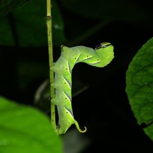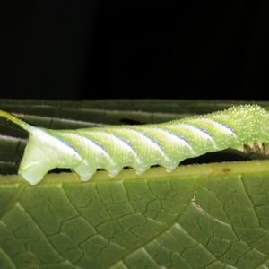 Eggs are laid on a variety of host plants belonging to the families Solanaceae, Verbenaceae, Fabaceae, Oleaceae, Bignoniaceae, and others. Mature larvae can attain a length of 125 mm and occur in green, yellow and brownish-grey colour forms (most commonly grey), with oblique body stripes and a prickly tail horn that is curled at the extreme tip. When molested the caterpillar throws the head and anterior segments of the body from side to side, at the same time making a rapidly repeated clicking noise, which appears to be produced by the mandibles. The larva pupates by pushing its head into the earth, burying itself, and making an ovoid chamber about 15 cm below the surface in which it sheds its skin. The larvae are often parasitised by tachinid flies.